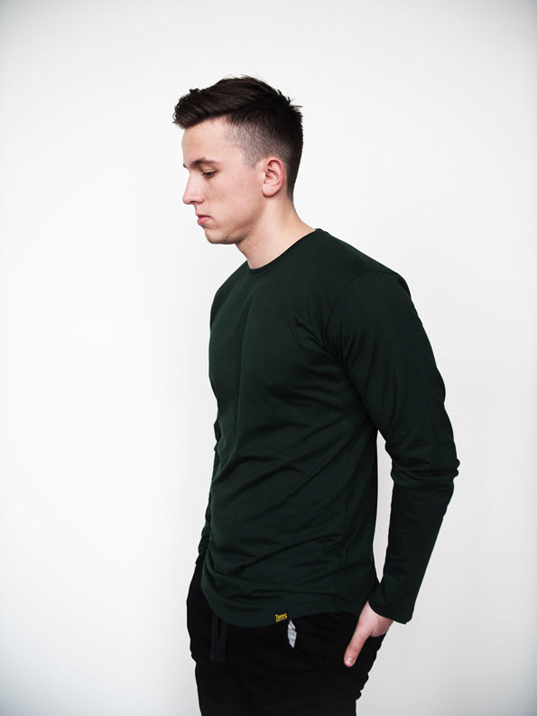Extended length long sleeve shirt features underarm patch designed to create an unrestricted feeling under the arms.
